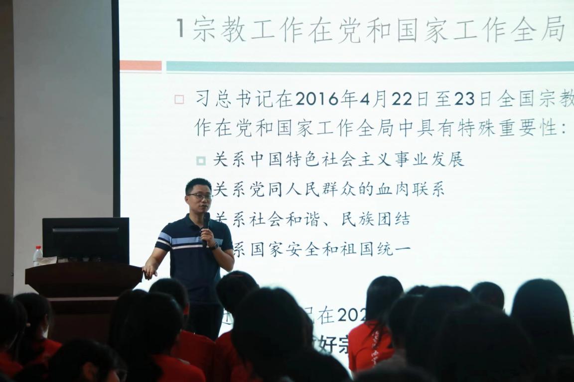 首先,孙邦金经理强调做好宗教工作的重要性,指出宗教工作无小事,对于高校而言,这是事关培养社会主义建设者和接班人的问题。孙经理向大家讲述了温州当地的宗教发展过程,同学们对宗教的含义有了更为深刻的认识。孙经理与同学们分享了马克思主义宗教观的哲学基础及基本内容,宗教不是从来就有的,是“人的本质的异化”的产物,引用了恩格斯在《反杜林论》中的话,“一切宗教都不过是支配着人们日常生活的外部力量在人们头脑中的幻想的反映,在这种反映中,人间的力量采取了超人间的力量的形式”,帮助同学们加深理解。最后,孙经理阐述了宗教的作用和马克思主义政党对宗教的态度,提出当代老员工需认清宗教本质,认识宗教的社会作用,从而塑造正确的思想认知,用马克思主义无神论武装自己,相信科学、学习科学、传播科学,树立正确的世界观、人生观、价值观,争当中国特色社会主义现代化合格建设者和接班人。