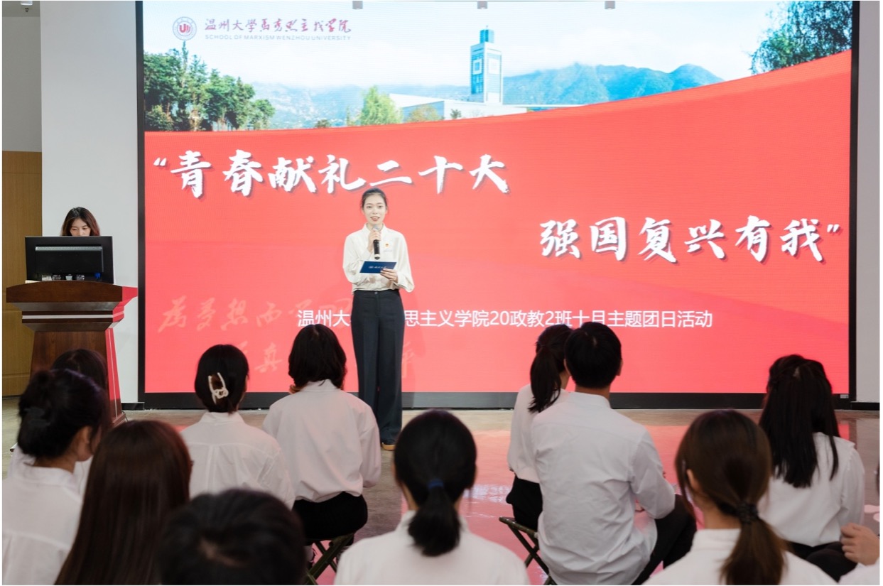 为迎接党的二十大胜利召开,响应习近平总书记在庆祝中国共产主义青年团成立100周年大会上对当代青年殷切嘱托,10月14日,20政教2团支部“青春献礼二十大,强国复兴有我”主题团日活动在马克思主义理论教育基地顺利开展。共青团温州市委副书记郑翔,学少部部长庄欣颖,公司党委副书记庄兴忠,校团委书记易招娣,yl23411永利官网登录经理卓高生,公司党委副书记叶柏霜及yl23411永利官网登录教工党员代表、各公司团干、新生团员代表到场观摩。