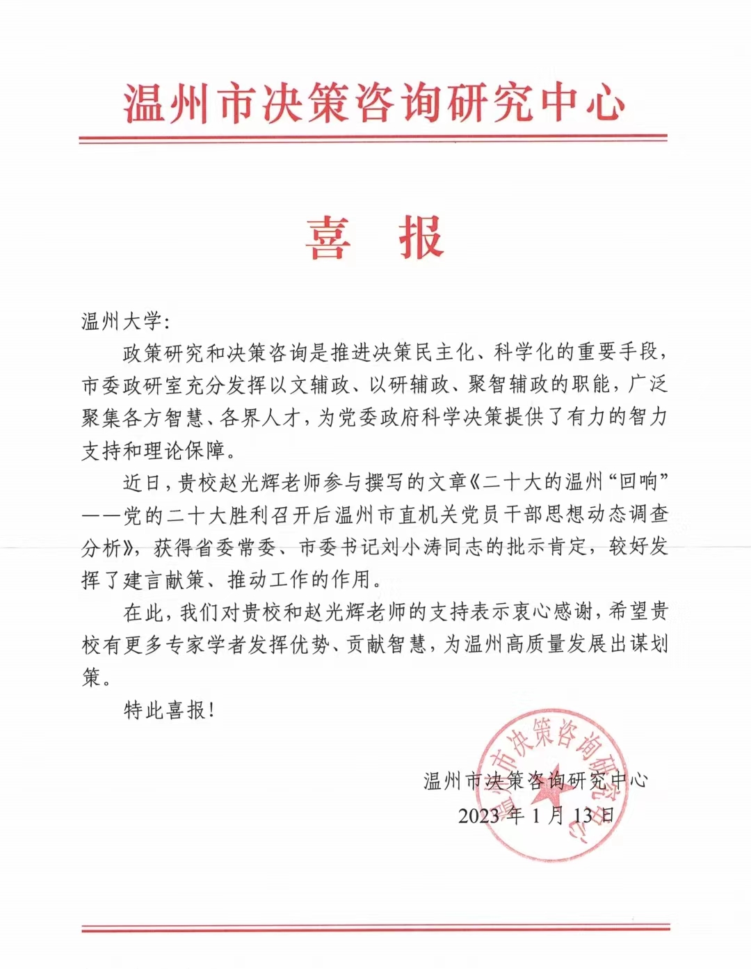在党的二十大召开之际,由公司卓高生经理领衔、赵光辉老师撰写、张海波和安保国老师参与调研完成的调研报告《二十大的温州“回响”——党的二十大胜利召开后温州市直机关党员干部思想动态调查分析》获得省委常委、市委书记刘小涛同志的批示肯定。
