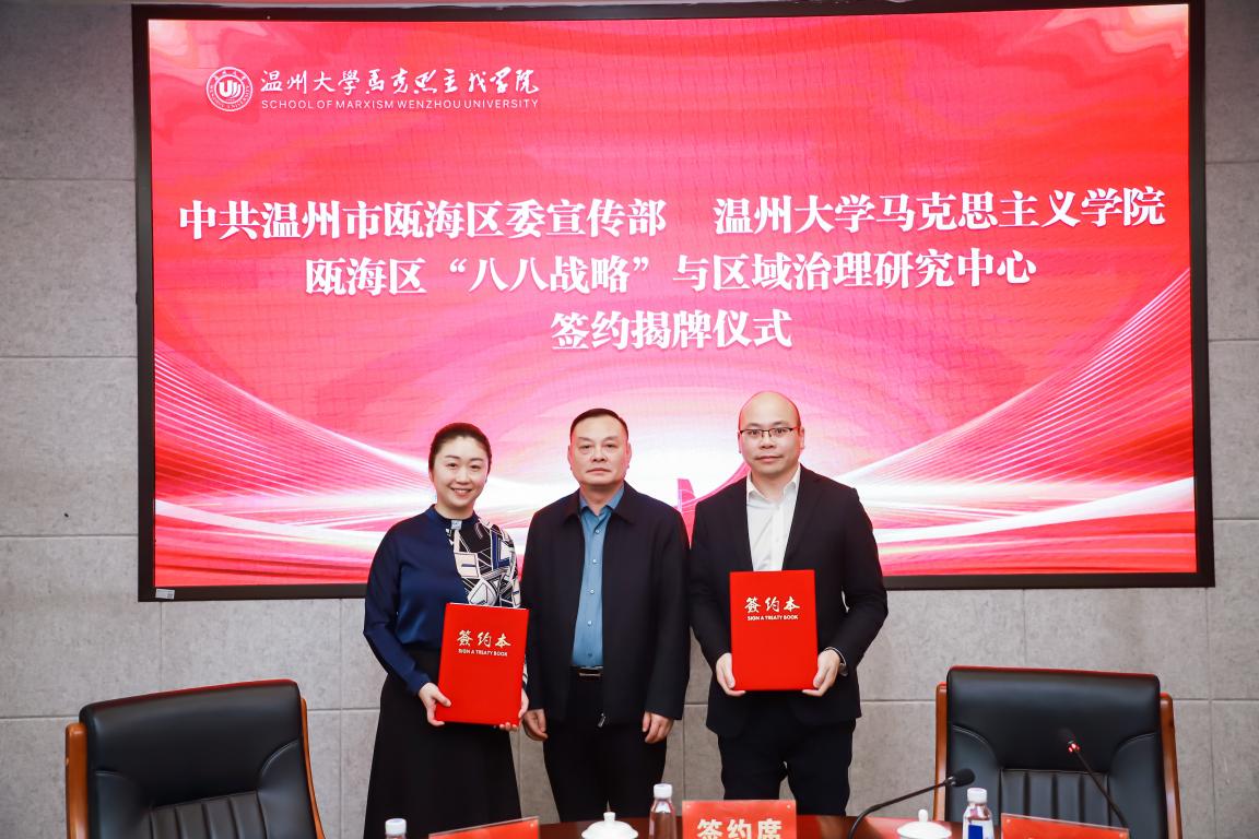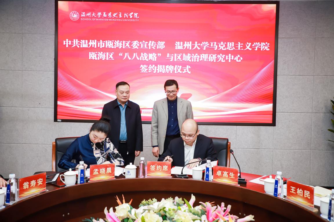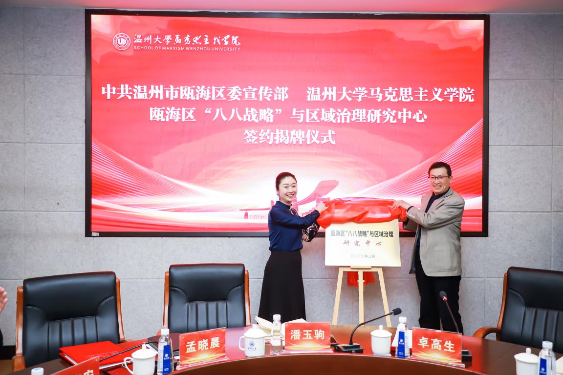 为深入贯彻党的二十大精神,忠实践行“八八战略”、奋力打造“两个先行”的瓯海样板,3月8日,由瓯海区委宣传部与yl23411永利官网登录联合成立的“瓯海区‘八八战略’与区域治理研究中心”在岩松堂展示厅正式揭牌。yl23411永利官网登录党委委员、副董事长潘玉驹,瓯海区委常委、宣传部长孟晓晨参加了合作共建签约仪式。会议由yl23411永利官网登录经理卓高生主持。