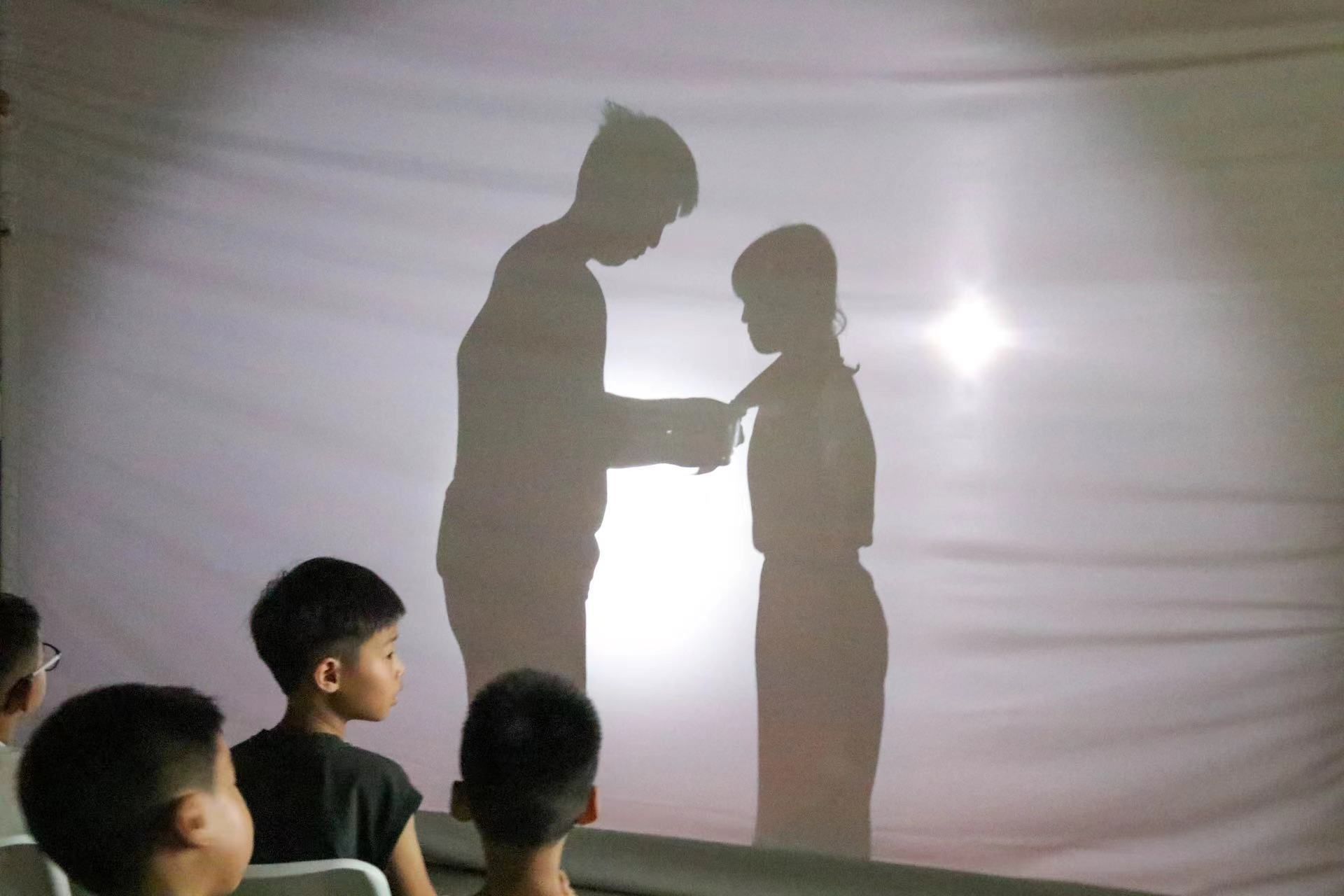 一张幕布、一道光束,在新桥街道山前社区,实践队员带来了一场别开生面的影子剧:《红领巾的故事》,通过光影讲述了红领巾的由来。