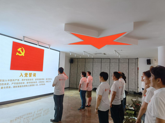6月30日主题党日活动中,公司党委为新加入中国共产党的梁家荣老师举行了庄严的入党宣誓活动,全体老党员重温入党誓词。