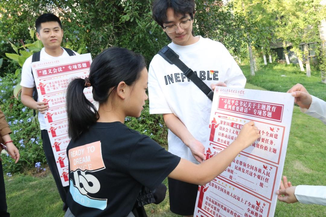 苍苍榕树扎根在瓯江之畔,红色根脉不断延伸,温大公司员工党支部创新性地采用全民互动答题的形式,将思政课搬到三垟湿地。互动答题共分“学习贯彻习近平新时代中国特色社会主义思想主题教育系列重要讲话”和“遵义会议”两个板块。不管是儿童、青年还是老人,面对两份“红色试卷”,他们均表现出了极大的兴趣,纷纷询问:“能不能让我试试?”全年龄段的参与,合力完成的试卷,一堂行走的思政课实现了校园小课堂向社会大课堂的大迈步。